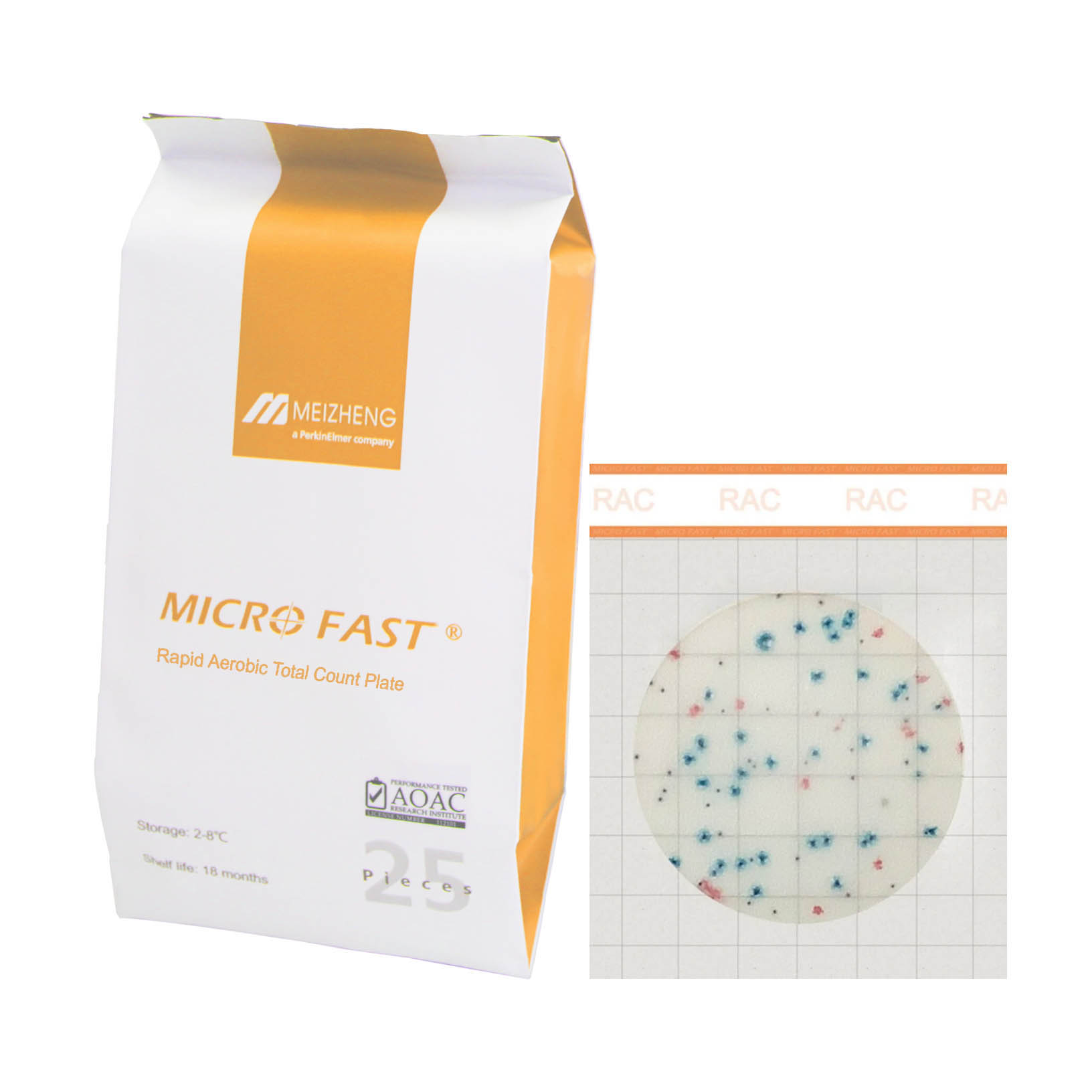 MicroFast®總生菌數(Rapid Aerobic Total Count,簡稱RAC)快檢片為預製型培養基,採用創新的冷水凝膠技術和新一代的微生物顯色技術,能夠讓菌落快速增殖並顯現顏色,並省去傳統培養基配置流程,製程符合ISO9001品質管理系統,產品通過美國AOAC國際公定分析化學家協會認證,適用於各類食品、食品原料及環境...等中總生菌數的測定。
